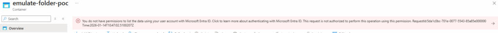 You do not have permissions to list the data using your user account with Microsoft Entra ID. Click to learn more about authenticating with Microsoft Entra ID. This request is not authorized to perform this operation using this permission. RequestId:9d758b8a-c01e-003f-7470-85b569000000 Time:2026-01-14T16:08:29.5229220Z