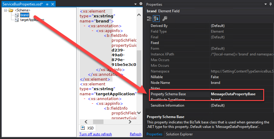 - In the property schema, add the element you want to promote to the service bus. In my case, I add: