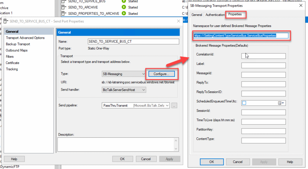 - On the SB-Messaging Transport Properties window, select the Properties tab and on the Namespace for user defined Brokered Message Properties property type your Property schema namespace